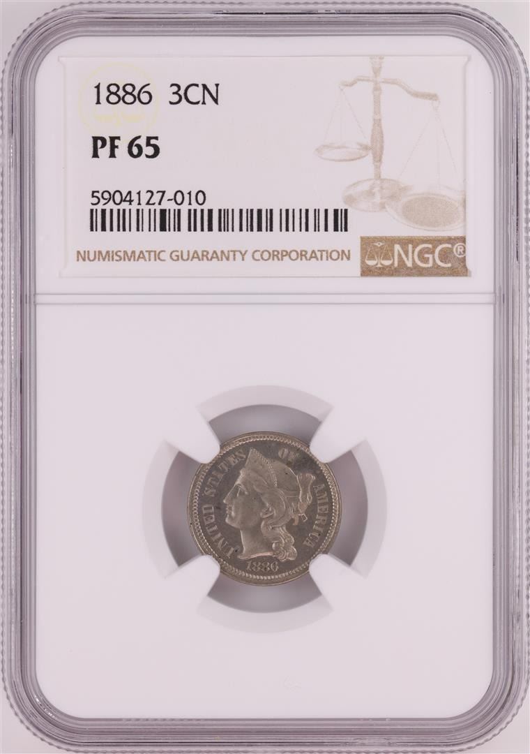 One 1886 Proof Three Cent Nickel Coin NGC PF65. NGC Certified.