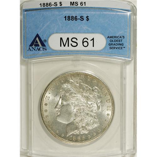 <B>1886-S $1 MS61 ANACS.</B></I> NGC Census: (143/1791). PCGS Population (228/3431). Mintage: 750,000. Numismedia Wsl. Price: $229. (#7170)<BR><BR><b>Shipping:</b> Coins & Currency (<a target="_blank" href="http://www.heritageauctions.com/common/shipping.php">view shipping information</a>)