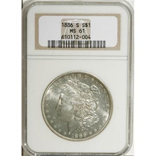 <B>1886-S $1 MS61 NGC.</B></I> NGC Census: (152/1915). PCGS Population (232/3569). Mintage: 750,000. Numismedia Wsl. Price for NGC/PCGS coin in MS61: $250. (#7170)<BR><BR><B>Coin Engraver:</B> George T. Morgan<BR><BR><b>Shipping:</b> Coins & Currency (<a target="_blank" href="http://www.heritageauctions.com/common/shipping.php">view shipping information</a>)