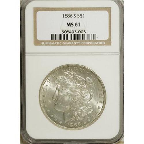 <B>1886-S $1 MS61 NGC.</B></I> NGC Census: (158/1966). PCGS Population (232/3659). Mintage: 750,000. Numismedia Wsl. Price for NGC/PCGS coin in MS61: $250. (#7170)<BR><BR><B>Coin Engraver:</B> George T. Morgan<BR><BR><b>Shipping:</b> Coins & Currency (<a target="_blank" href="http://www.heritageauctions.com/common/shipping.php">view shipping information</a>)