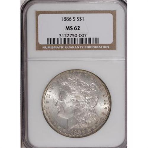 <B>1886-S $1 MS62 NGC.</B></I> NGC Census: (468/1487). PCGS Population (867/2784). Mintage: 750,000. Numismedia Wsl. Price for NGC/PCGS coin in MS62: $280. (#7170)<BR><BR><B>Coin Engraver:</B> George T. Morgan<BR><BR><b>Shipping:</b> Coins & Currency (<a target="_blank" href="http://www.heritageauctions.com/common/shipping.php">view shipping information</a>)