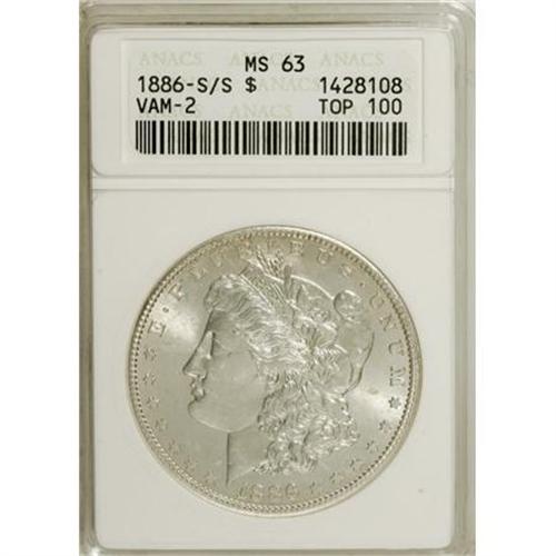 <B>1886-S/S $1 MS63 ANACS.</B></I> VAM-2, Top-100. NGC Census: (724/721). PCGS Population (1392/1277). Mintage: 750,000. Numismedia Wsl. Price for NGC/PCGS coin in MS63: $360. (#7170)<BR><BR><B>Coin Engraver:</B> George T. Morgan<BR><BR><b>Shipping:</b> Coins & Currency (<a target="_blank" href="http://www.heritageauctions.com/common/shipping.php">view shipping information</a>\)