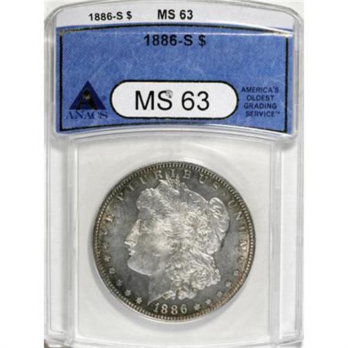 <B>1886-S $1 MS63 ANACS.</B></I> NGC Census: (729/728). PCGS Population (1393/1283). Mintage: 750,000. Numismedia Wsl. Price for NGC/PCGS coin in MS63: $360. (#7170)<BR><BR><B>Coin Engraver:</B> George T. Morgan<BR><BR><b>Shipping:</b> Coins & Currency (<a target="_blank" href="http://www.heritageauctions.com/common/shipping.php">view shipping information</a>)