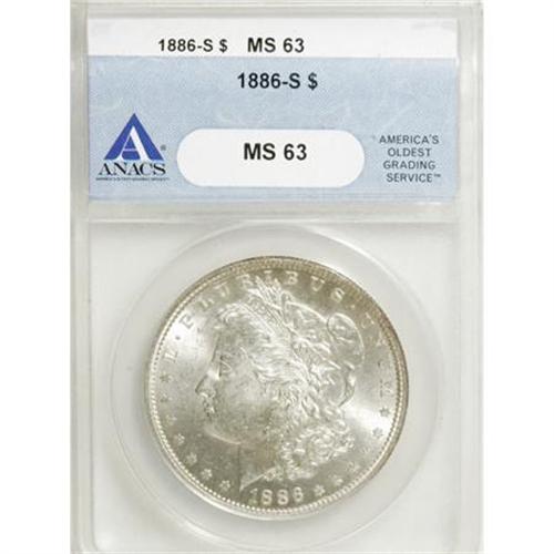 <B>1886-S $1 MS63 ANACS.</B></I> NGC Census: (745/726). PCGS Population (1432/1321). Mintage: 750,000. Numismedia Wsl. Price for NGC/PCGS coin in MS63: $360. (#7170)<BR><BR><B>Coin Engraver:</B> George T. Morgan<BR><BR><b>Shipping:</b> Coins & Currency (<a target="_blank" href="http://www.heritageauctions.com/common/shipping.php">view shipping information</a>)