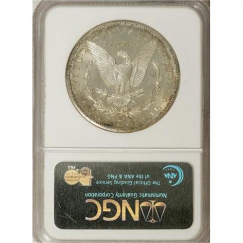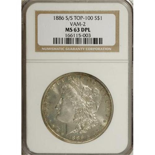 <B>1886-S $1 MS63 Deep Mirror Prooflike NGC.</B></I> VAM-2. A Top 100 Variety. The mintmark is nicely repunched on this popular VAM variety. A crisply struck and nicely preserved Silver Dollar. Light honey and sky-blue colors. DMPLs are rare for this issue. Census: 21 in 63 Deep Mirror Prooflike, 13 finer (7/07).<BR><BR><b>Shipping:</b> Coins & Currency (<a target="_blank" href="http://www.heritageauctions.com/common/shipping.php">view shipping information</a>)