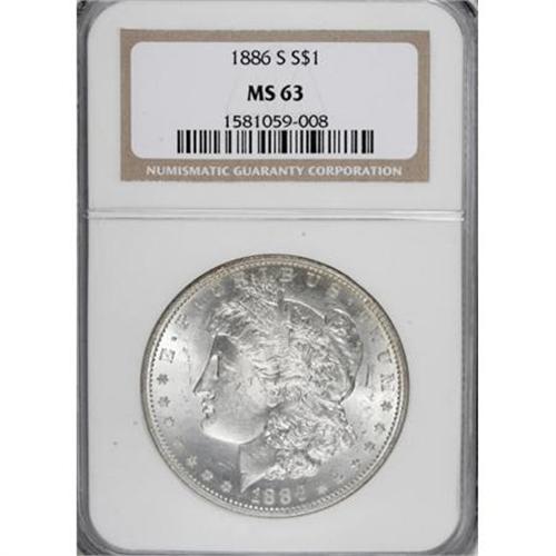 <B>1886-S $1 MS63 NGC.</B></I> NGC Census: (734/731). PCGS Population (1401/1291). Mintage: 750,000. Numismedia Wsl. Price for NGC/PCGS coin in MS63: $360. (#7170)<BR><BR><B>Coin Engraver:</B> George T. Morgan<BR><BR><b>Shipping:</b> Coins & Currency (<a target="_blank" href="http://www.heritageauctions.com/common/shipping.php">view shipping information</a>)