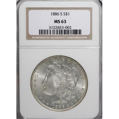 <B>1886-S $1 MS63 NGC.</B></I> NGC Census: (760/734). PCGS Population (1449/1341). Mintage: 750,000. Numismedia Wsl. Price for NGC/PCGS coin in MS63: $360. (#7170)<BR><BR><B>Coin Engraver:</B> George T. Morgan<BR><BR><b>Shipping:</b> Coins & Currency (<a target="_blank" href="http://www.heritageauctions.com/common/shipping.php">view shipping information</a>)
