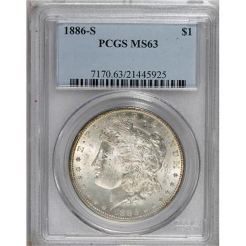 <B>1886-S $1 MS63 PCGS.</B></I> PCGS Population (1416/1312). NGC Census: (734/731). Mintage: 750,000. Numismedia Wsl. Price for NGC/PCGS coin in MS63: $360. (#7170)<BR><BR><B>Coin Engraver:</B> George T. Morgan<BR><BR><b>Shipping:</b> Coins & Currency (<a target="_blank" href="http://www.heritageauctions.com/common/shipping.php">view shipping information</a>)