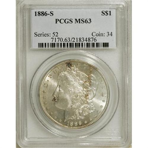 <B>1886-S $1 MS63 PCGS.</B></I> PCGS Population (1449/1341). NGC Census: (760/734). Mintage: 750,000. Numismedia Wsl. Price for NGC/PCGS coin in MS63: $360. (#7170)<BR><BR><B>Coin Engraver:</B> George T. Morgan<BR><BR><b>Shipping:</b> Coins & Currency (<a target="_blank" href="http://www.heritageauctions.com/common/shipping.php">view shipping information</a>)