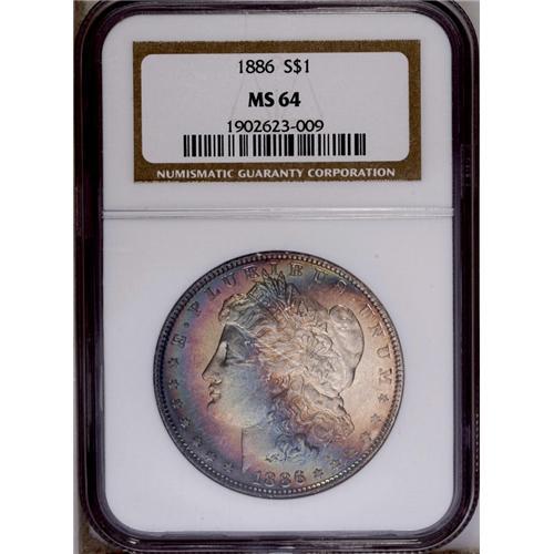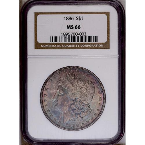 <B>1886<img border='0' src='http://www.heritagecoins.com/images/star.gif' width=10 height=10>$1> MS64 NGC,</B></I> concentric bands of peach, ruby, and blue-green iridescence embrace both sides; <B>1886 MS65 NGC,</B></I> dramatic peach, navy-blue, and rose toning blankets this shimmering Gem; and an <B>1886 MS66 NGC,</B></I> russet, electric-blue, and olive-green patina cedes to a brilliant reverse center.