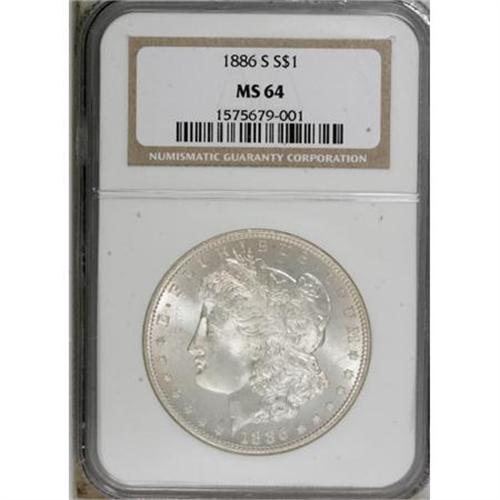 <B>1886-S $1 MS64 NGC.</B></I> NGC Census: (613/115). PCGS Population (1014/268). Mintage: 750,000. Numismedia Wsl. Price for NGC/PCGS coin in MS64: $600. (#7170)<BR><BR><B>Coin Engraver:</B> George T. Morgan<BR><BR><b>Shipping:</b> Coins & Currency (<a target="_blank" href="http://www.heritageauctions.com/common/shipping.php">view shipping information</a>)