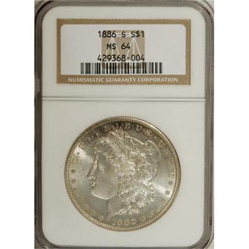 <B>1886-S $1 MS64 NGC.</B></I> NGC Census: (613/115). PCGS Population (1014/271). Mintage: 750,000. Numismedia Wsl. Price for NGC/PCGS coin in MS64: $600. (#7170)<BR><BR><B>Coin Engraver:</B> George T. Morgan<BR><BR><b>Shipping:</b> Coins & Currency (<a target="_blank" href="http://www.heritageauctions.com/common/shipping.php">view shipping information</a>)