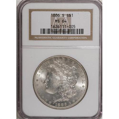 <B>1886-S $1 MS64 NGC.</B></I> A few scattered marks on the cheek and in the fields prevent a Gem grade for this frosty and lustrous piece. Both sides are brilliant and the design elements are boldly defined.<BR><BR><B>Coin Engraver:</B> George T. Morgan<BR><BR><b>Shipping:</b> Coins & Currency (<a target="_blank" href="http://www.heritageauctions.com/common/shipping.php">view shipping information</a>)