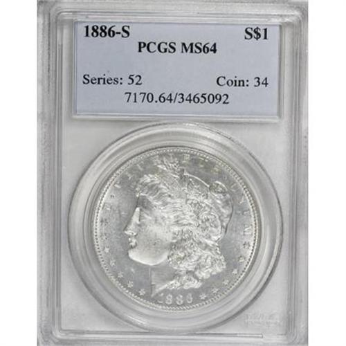 <B>1886-S $1 MS64 PCGS.</B></I> PCGS Population (1038/283). NGC Census: (608/116). Mintage: 750,000. Numismedia Wsl. Price for NGC/PCGS coin in MS64: $600. (#7170)<BR><BR><B>Coin Engraver:</B> George T. Morgan<BR><BR><b>Shipping:</b> Coins & Currency (<a target="_blank" href="http://www.heritageauctions.com/common/shipping.php">view shipping information</a>)
