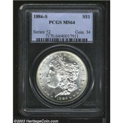 <TR><TD width="100%"><TABLE cellSpacing=1 cellPadding=3 width="100%" border=0><TBODY><TR><TD width="100%" bgColor=#79735c><FONT face=arial color=#ffffff size=3><B>Description</B> </FONT></TD></TR><TR><TD width="100%" bgColor=#ffffff><FONT face=arial size=2><B>1886-S $1 MS64 PCGS.</B></I> A flashy and well struck near-Gem with clean surfaces. The date has a few tiny specks of greenish verdigris, and a tiny spot after the final A in AMERICA has a short wispy pinscratch. </FONT></TD></TR></TBODY></TABLE></TD></TR></TBODY></TABLE><BR><A name=PricesRealized></A><TABLE cellSpacing=0 cellPadding=0 width="100%" bgColor=#000000 border=0><TBODY><TR><TD width="100%"><TABLE cellSpacing=1 cellPadding=3 width="100%" border=0><TBODY><TR><TD width="100%" bgColor=#79735c><A name=PR><FONT face=arial color=#ffffff size=3><B>Previous Prices from Heritage Auctions</B> </FONT></A></TD></TR><TR><TD bgColor=#f6f6ed><TABLE cellSpacing=0 cellPadding=0 width="100%" border=1><TBODY><TR><TD align=middle width="33%"><B>Date</B></TD><TD align=middle width="33%"><B>Service</B></TD><TD align=middle width="33%"><B>Price</B></TD></TR><TR bgColor=whitesmoke><TD width="33%"><B>01/21/2003</B></TD><TD width="33%">PCGS</TD><TD width="33%">$448.50</TD></TR><TR bgColor=whitesmoke><TD width="33%"><B>01/11/2003</B></TD><TD width="33%">PCGS</TD><TD width="33%">$460.00</TD></TR><TR bgColor=whitesmoke><TD width="33%"><B>01/11/2003</B></TD><TD width="33%">PCGS</TD><TD width="33%">$460.00</TD></TR><TR bgColor=whitesmoke><TD width="33%"><B>12/31/2002</B></TD><TD width="33%">PCGS</TD><TD width="33%">$391.00</TD></TR><TR bgColor=whitesmoke><TD width="33%"><B>11/23/2002</B></TD><TD width="33%">PCGS</TD><TD width="33%">$391.00</TD></TR><TR bgColor=whitesmoke><TD width="33%"><B>11/23/2002</B></TD><TD width="33%">PCGS</TD><TD width="33%">$391.00</TD></TR><TR bgColor=whitesmoke><TD width="33%"><B>10/08/2002</B></TD><TD width="33%">PCGS</TD><TD width="33%">$425.50</TD></TR><TR bgColor=whitesmoke><TD width="33%"><B>09/28/2002</B></TD><TD width="33%">PCGS</TD><TD width="33%">$488.75</TD></TR><TR bgColor=whitesmoke><TD width="33%"><B>09/28/2002</B></TD><TD width="33%">PCGS</TD><TD width="33%">$488.75</TD></TR><TR bgColor=whitesmoke><TD width="33%"><B>09/17/2002</B></TD><TD width="33%">PCGS</TD><TD width="33%">$403.65</TD></TR><TR bgColor=whitesmoke><TD width="33%"><B>06/22/2000</B></TD><TD width="33%">PCGS</TD><TD width="33%">$529.00</TD></TR><TR bgColor=whitesmoke><TD width="33%"><B>06/22/2000</B></TD><TD width="33%">PCGS</TD><TD width="33%">$529.00</TD></TR><TR bgColor=whitesmoke><TD width="33%"><B>07/30/2002</B></TD><TD width="33%">PCGS</TD><TD width="33%">$356.50</TD></TR><TR bgColor=whitesmoke><TD width="33%"><B>07/30/2002</B></TD><TD width="33%">PCGS</TD><TD width="33%">$356.50</TD></TR><TR bgColor=whitesmoke><TD width="33%"><B>07/30/2002</B></TD><TD width="33%">PCGS</TD><TD width="33%">$356.50</TD></TR><TR bgColor=whitesmoke><TD width="33%"><B>07/30/2002</B></TD><TD width="33%">PCGS</TD><TD width="33%">$391.00</TD></TR><TR bgColor=whitesmoke><TD width="33%"><B>07/02/2002</B></TD><TD width="33%">PCGS</TD><TD width="33%">$391.00</TD></TR><TR bgColor=whitesmoke><TD width="33%"><B>07/02/2002</B></TD><TD width="33%">PCGS</TD><TD width="33%">$391.00</TD></TR><TR bgColor=whitesmoke><TD width="33%"><B>06/08/2002</B></TD><TD width="33%">PCGS</TD><TD width="33%">$506.00</TD></TR><TR bgColor=whitesmoke><TD width="33%"><B>04/28/2002</B></TD><TD width="33%">PCGS</TD><TD width="33%">$391.00</TD></TR><TR bgColor=whitesmoke><TD width="33%"><B>04/28/2002</B></TD><TD width="33%">PCGS</TD><TD width="33%">$391.00</TD></TR><TR bgColor=whitesmoke><TD width="33%"><B>04/27/2002</B></TD><TD width="33%">PCGS</TD><TD width="33%">$437.00</TD></TR><TR bgColor=whitesmoke><TD width="33%"><B>04/27/2002</B></TD><TD width="33%">PCGS</TD><TD width="33%">$632.50</TD></TR><TR bgColor=whitesmoke><TD width="33%"><B>04/27/2002</B></TD><TD width="33%">PCGS</TD><TD width="33%">$632.50</TD></TR><TR bgColor=whitesmoke><TD width="33%"><B>11/06/2001</B></TD><TD width="33%">PCGS</TD><TD width="33%">$380.00</TD></TR><TR bgColor=whitesmoke><TD width="33%"><B>11/18/1999</B></TD><TD width="33%">PCGS</TD><TD width="33%">$373.75</TD></TR><TR bgColor=whitesmoke><TD width="33%"><B>11/18/1999</B></TD><TD width="33%">PCGS</TD><TD width="33%">$373.75</TD></TR><TR bgColor=whitesmoke><TD width="33%"><B>05/02/2000</B></TD><TD width="33%">PCGS</TD><TD width="33%">$451.00</TD></TR><TR bgColor=whitesmoke><TD width="33%"><B>12/28/1999</B></TD><TD width="33%">PCGS</TD><TD width="33%">$420.00</TD></TR><TR bgColor=whitesmoke><TD width="33%"><B>12/28/1999</B></TD><TD width="33%">PCGS</TD><TD width="33%">$420.00</TD></TR><TR bgColor=whitesmoke><TD width="33%"><B>03/02/2000</B></TD><TD width="33%">PCGS</TD><TD width="33%">$425.50</TD></TR><TR bgColor=whitesmoke><TD width="33%"><B>06/02/2001</B></TD><TD width="33%">PCGS</TD><TD width="33%">$379.50</TD></TR><TR bgColor=whitesmoke><TD width="33%"><B>06/02/2001</B></TD><TD width="33%">PCGS</TD><TD width="33%">$379.50</TD></TR><TR bgColor=whitesmoke><TD width="33%"><B>06/02/2001</B></TD><TD width="33%">PCGS</TD><TD width="33%">$385.25</TD></TR><TR bgColor=whitesmoke><TD width="33%"><B>05/31/2001</B></TD><TD width="33%">PCGS</TD><TD width="33%">$391.00</TD></TR><TR bgColor=whitesmoke><TD width="33%"><B>05/31/2001</B></TD><TD width="33%">PCGS</TD><TD width="33%">$391.00</TD></TR><TR bgColor=whitesmoke><TD width="33%"><B>04/05/2001</B></TD><TD width="33%">PCGS</TD><TD width="33%">$373.75</TD></TR><TR bgColor=whitesmoke><TD width="33%"><B>02/27/2001</B></TD><TD width="33%">PCGS</TD><TD width="33%">$390.00</TD></TR><TR bgColor=whitesmoke><TD width="33%"><B>02/27/2001</B></TD><TD width="33%">PCGS</TD><TD width="33%">$390.00</TD></TR><TR bgColor=whitesmoke><TD width="33%"><B>01/09/2001</B></TD><TD width="33%">PCGS</TD><TD width="33%">$390.00</TD></TR><TR bgColor=whitesmoke><TD width="33%"><B>01/05/2001</B></TD><TD width="33%">PCGS</TD><TD width="33%">$661.25</TD></TR><TR 