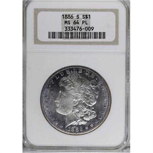 <B>1886-S $1 MS64 Prooflike NGC.</B></I> Both sides are reflective beneath thin veils of hazy amethyst and silver-gray patina. Solidly struck with more luster grazes than actual marks, though a planchet flaw appears above the first 8 in the date.<BR><I>From The Mario Eller Collection, Part One.</B></I><BR><BR><B>Coin Engraver:</B> George T. Morgan<BR><BR><b>Shipping:</b> Coins & Currency (<a target="_blank" href="http://www.heritageauctions.com/common/shipping.php">view shipping information</a>)