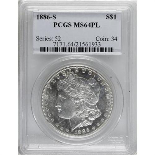 <B>1886-S $1 MS64 Prooflike PCGS.</B></I> This essentially untoned specimen is nicely preserved and very attractive. The prooflikeness in the fields is noticeable, if not spectacular, and the central devices show a mild amount of frosting. Marks are minimal, especially on the reverse. Population: 58 in 64 Prooflike, 24 finer (6/07). <BR><I>From the Diamond Head Registry Set of Prooflike Dollars.</B></I><BR><BR><B>Coin Engraver:</B> George T. Morgan<BR><BR><b>Shipping:</b> Coins & Currency (<a target="_blank" href="http://www.heritageauctions.com/common/shipping.php">view shipping information</a>\)