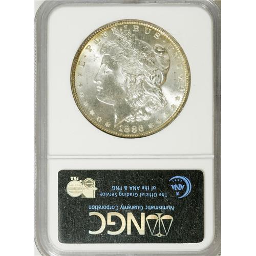 <B>1886 S$1 MS64 <img border='0' src='http://www.heritagecoins.com/images/star.gif' width=10 height=10> NGC.</B></I> Ex: Battle Creek Collection. The flag of the 1 is repunched. Dramatic ruby-red, gold, sea-green, and navy-blue endow the reverse of this lustrous and exactingly struck Gem. The obverse has only a hint of peripheral gold toning.<BR><I>From The Temecula Collection, Part Two.</B></I><BR><BR><b>Shipping:</b> Coins & Currency (<a target="_blank" href="http://www.heritageauctions.com/common/shipping.php">view shipping information</a>)