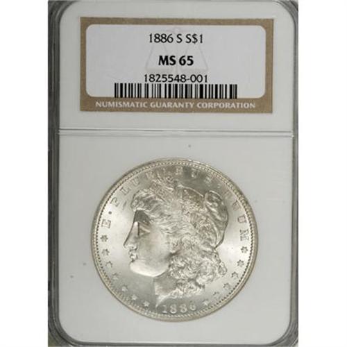 <B>1886-S $1 MS65 NGC.</B></I> Most Uncirculated 1886-S dollars exist in the lower grade ranges of MS60 to MS63 or MS64. A sharp drop occurs in the certified population at the MS65 level. The current Gem received an attentive strike, and possesses attractive luster. Essentially untoned surfaces are generally better preserved than what might be expected for the grade designation.<BR><I>From The Arnold & Harriet Collection, Part Two.</B></I><BR><BR><B>Coin Engraver:</B> George T. Morgan<BR><BR><b>Shipping:</b> Coins & Currency (<a target="_blank" href="http://www.heritageauctions.com/common/shipping.php">view shipping information</a>)