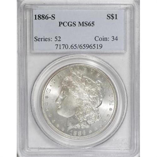 <B>1886-S $1 MS65 PCGS.</B></I> VAM-2. A Top 100 Variety. A wonderfully flashy '86-S that is sharply defined throughout, with only the most trivial abrasions. A shallow scrape under Liberty's eye is noted for identification purposes. Both sides are brilliant, with faint suggestions of golden tone. This popular San Francisco issue is infrequently found in higher grades. <BR><BR><B>Coin Engraver:</B> George T. Morgan<BR><BR><b>Shipping:</b> Coins & Currency (<a target="_blank" href="http://www.heritageauctions.com/common/shipping.php">view shipping information</a>\)