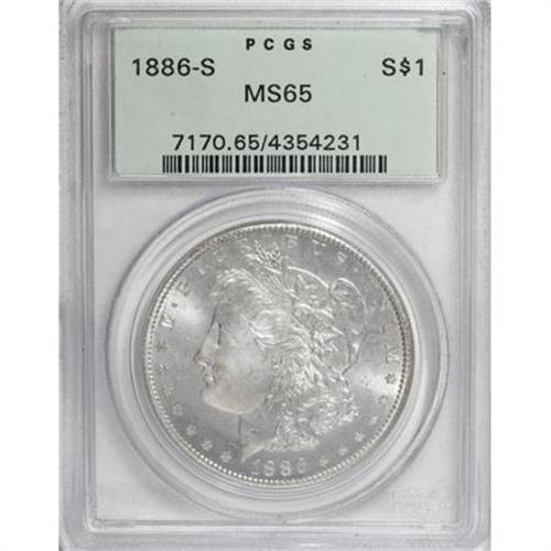 <B>1886-S $1 MS65 PCGS.</B></I> VAM-2. A Top 100 Variety. The mintmark is lightly repunched. A nearly brilliant and moderately prooflike Gem. A bold strike with only trivial incompleteness at the centers. The reverse is exceptionally preserved, and on its own merits a finer grade. Housed in a green label holder.<BR><I>From The Silver Spur Collection of Morgan Dollars.</B></I><BR><BR><B>Coin Engraver:</B> George T. Morgan<BR><BR><b>Shipping:</b> Coins & Currency (<a target="_blank" href="http://www.heritageauctions.com/common/shipping.php">view shipping information</a>)