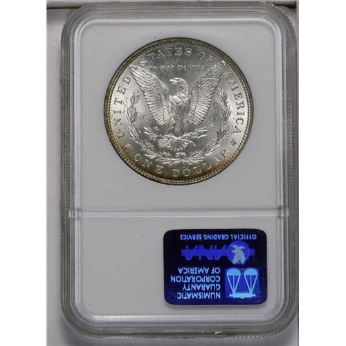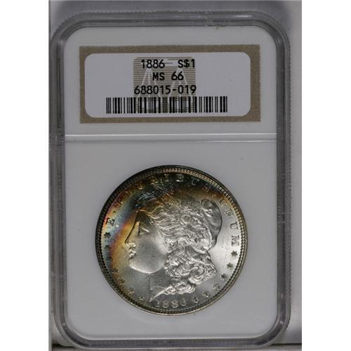 <B>1886<img border='0' src='http://www.heritagecoins.com/images/star.gif' width=10 height=10>$1> MS66 NGC.</B></I> Lustrous surfaces are untoned save for a crescent of cobalt-blue, lavender, and gold-tan toning on the upper left obverse and lower reverse. The design elements are well brought up, including nice definition in the hair over Liberty's ear. Minimally abraded.