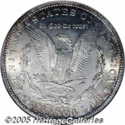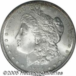<B>1886-S<img border='0' src='http://www.heritagecoins.com/images/star.gif' width=10 height=10>$1 MS66 NGC.</B></I> VAM-2. S over S Mintmark. Top 100 Variety. The attribution is not recognized on the NGC holder. The first S was tilted right, with the upper serif visible to the right of the final position, and the lower serif visible left of the final placement. This is a delightful Gem with wisps of pale gold toning, slightly more prominent on the reverse. This is an important opportunity for the variety specialist to acquire a Gem quality example of this repunched mintmark issue. This should be resubmitted to NGC for a review of the designation, as it would qualify as the single finest certified example of the variety.