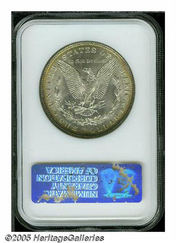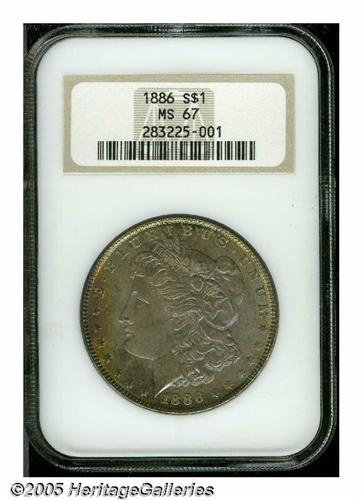 <B>1886<S$1> MS67 NGC.</B></I> A truly superlative example with rainbow obverse color that fades to an attractive matte violet on Liberty and to simple gold on the reverse rims. Some minute luster scuffs are noted, including a tiny one in the left obverse field for accuracy. Both services have graded only 9 coins higher. (6/05)