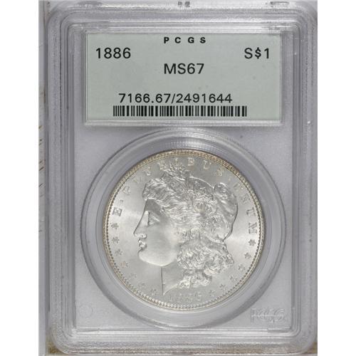 <B>1886 S$1 MS67 PCGS.</B></I> An essentially untoned Superb Gem that has wonderful luster and unusually solid definition on the devices. A few isolated and largely inconsequential marks appear on the surfaces. PCGS has certified just three pieces finer (9/06).<BR><BR><b>Shipping:</b> Coin/Currency (<a target="_blank" href="http://www.heritageauctions.com/common/shipping.php">view shipping information</a>)