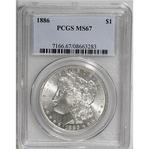 <B>1886<img border='0' src='http://www.heritagecoins.com/images/star.gif' width=10 height=10>$1> MS67 PCGS.</B></I> Brilliant throughout and fully struck with splendidly preserved, problem-free surfaces. An outstanding type coin.