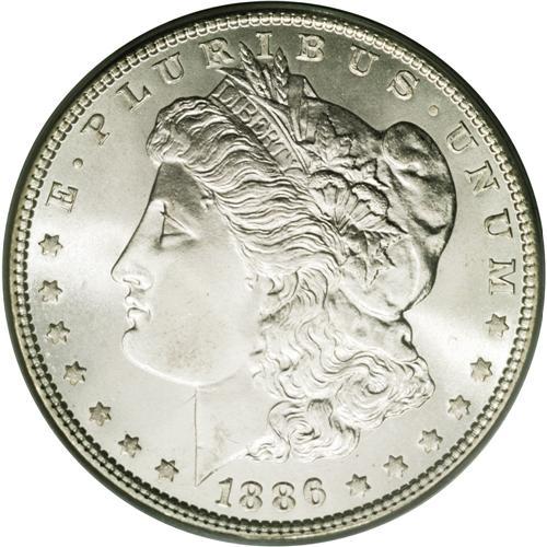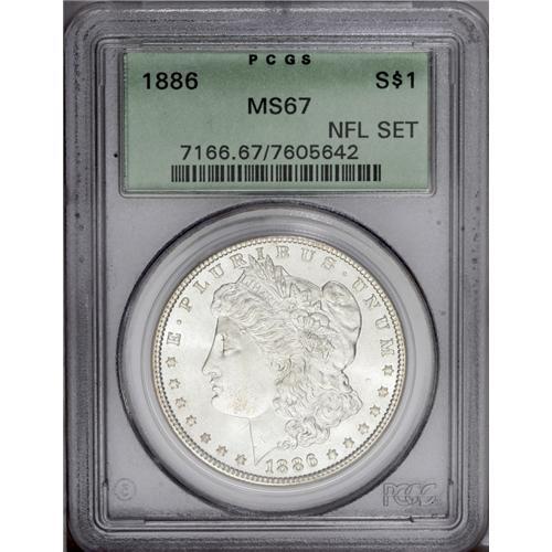 <B>1886<img border='0' src='http://www.heritagecoins.com/images/star.gif' width=10 height=10>$1> MS67 PCGS.</B></I> Ex: NFL Set. Like so many Morgan dollars in the Michael Casper collection, this is an important condition rarity. Although the date is common, it is almost always encountered in grades below Gem quality. Superb Gem examples are rare, as supported by the PCGS population data. This is a frosty and lustrous example with brilliant silver surfaces. Design elements are especially bold.<BR><I>Ex: Gregg Bingham NFL Collection, (Heritage, 1/01), lot 7940.</B></I><BR><I>From The Michael Casper Collection, Part Three.</B></I>