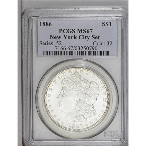 <B>1886<img border='0' src='http://www.heritagecoins.com/images/star.gif' width=10 height=10>$1> MS67 PCGS.</B></I> Ex: New York City Set. A lustrous, nearly brilliant, pinpoint-sharp, and spectacularly preserved Superb Gem. A common date in Mint State, but rarely seen with the present exceptional quality.<BR><I>From The Michael Casper Collection, Part Three.</B></I>