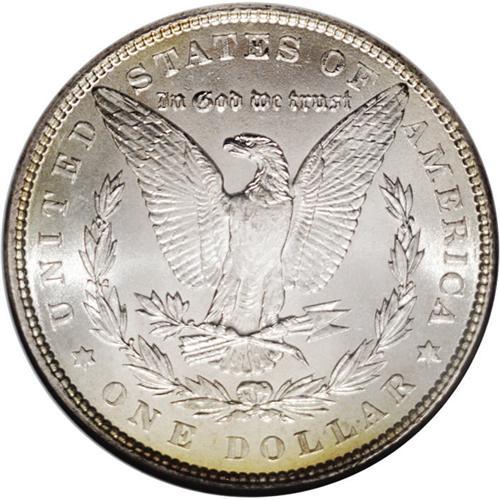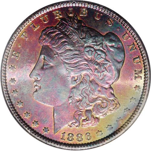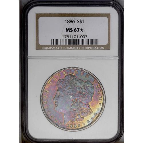 <B>1886<img border='0' src='http://www.heritagecoins.com/images/star.gif' width=10 height=10>$1> MS67 <img border='0' src='http://www.heritagecoins.com/images/star.gif' width=10 height=10> NGC.</B></I> The obverse is bathed with rich shades of yellow, blue-green, crimson and orange toning, and the reverse is mostly white with a touch on toning along the rims. As one would expect, the surfaces are immaculate and sparkling with luster. Bold definition is apparent on the design features, including the hair curls over the ear and the eagle's breast feathers. NGC has given only eight Superb Gems the Star designation, and none finer with Star (3/06). <BR><BR><B>Important notice:</B> Heritage usually auctions material at the rate of 200-250 lots per hour. On some occasions eBay Live bid software or the Internet may not be able to keep up with the pace of the auction. We recommend placing a realistic absentee bid now as insurance to avoid disappointment. Occasionally the auctioneer may eliminate or reject an eBay Live bid, and the auctioneer may also reopen a lot after the close of the eBay live bidding (usually because we missed an audience bid), and may reject your bid even if it shows you as the winning bidder. By bidding via eBay Live, you agree that Heritage may award the lot to another bidder at its sole discretion under the circumstances described above or any other reasonable circumstances. Since eBay bids are not shown to us until we open the lot on the floor, we treat those bids just like floor bids. In most cases the floor responds before the eBay bid is presented to us, due to Internet lag time, so for consistency we have made it a policy that floor bids are always considered first over tie eBay live bids. Also please note that all Heritage lots purchased through eBay Live carry a 20% Buyer's Premium. Please make sure you read the Terms and Conditions before you bid. This lot is being auctioned in conjunction with a live floor auction by Heritage Galleries & Auctioneers. All final auction and invoice information will be supplied by Heritage Galleries & Auctioneers, and all other information should be considered preliminary. Lot:3454 <BR><BR><B>Winning Notification and Billing:</B> After the FINAL session in this auction is complete, Heritage will send e-mail and snail mail invoices. This process normally takes several days. All final auction and invoice information will be supplied by Heritage Galleries & Auctioneers, and all other information should be considered preliminary. <BR><BR>This auction will be conducted on a live auction floor and over the Internet through eBay Live. If you choose to place an absentee bid, please take a moment to <font color='#0000ff'><u><a href='http://pages.ebay.com/liveauctions/help/before/laabsentee.html'>learn how eBay Live absentee bidding works</a></u></font><font color='#000000'>