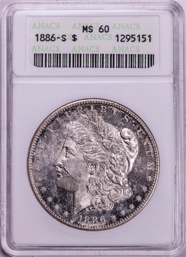 One 1886-S $1 Morgan Silver Dollar Coin ANACS MS60. ANACS Certified.