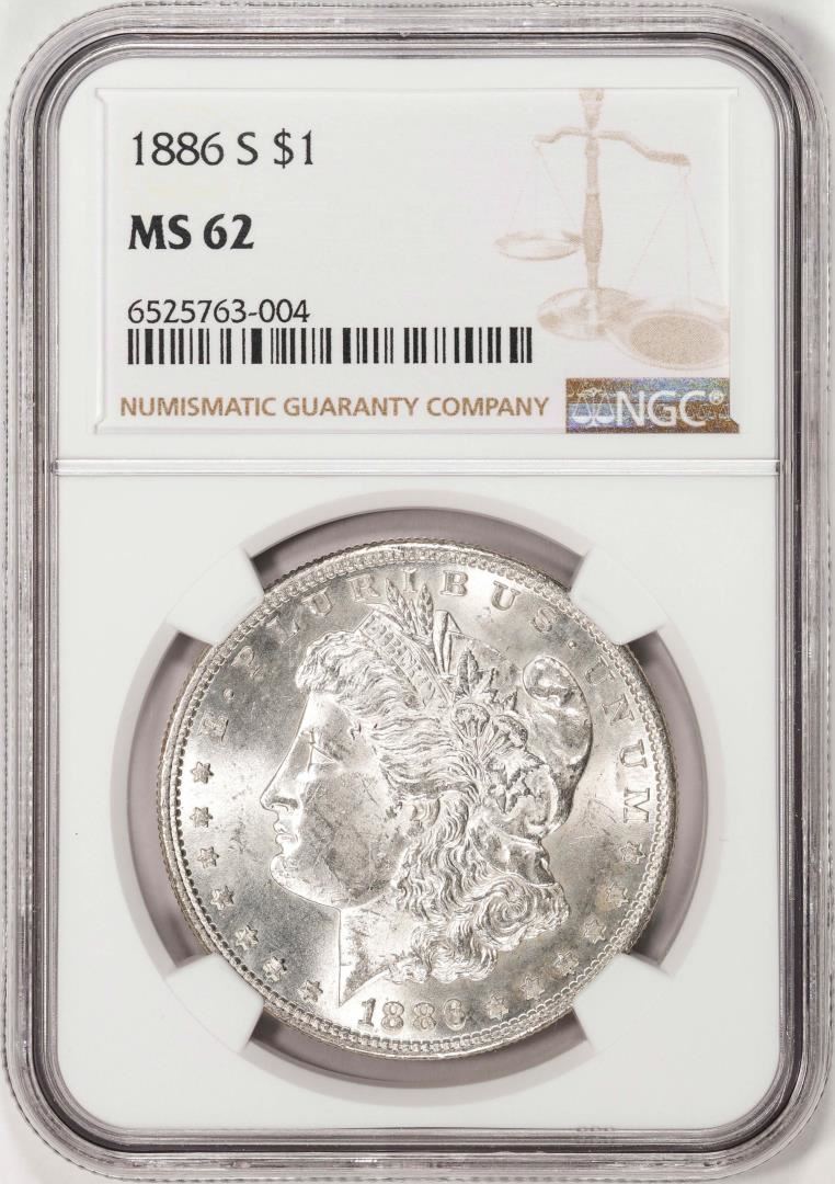One 1886-S $1 Morgan Silver Dollar Coin NGC MS62. NGC Certified.