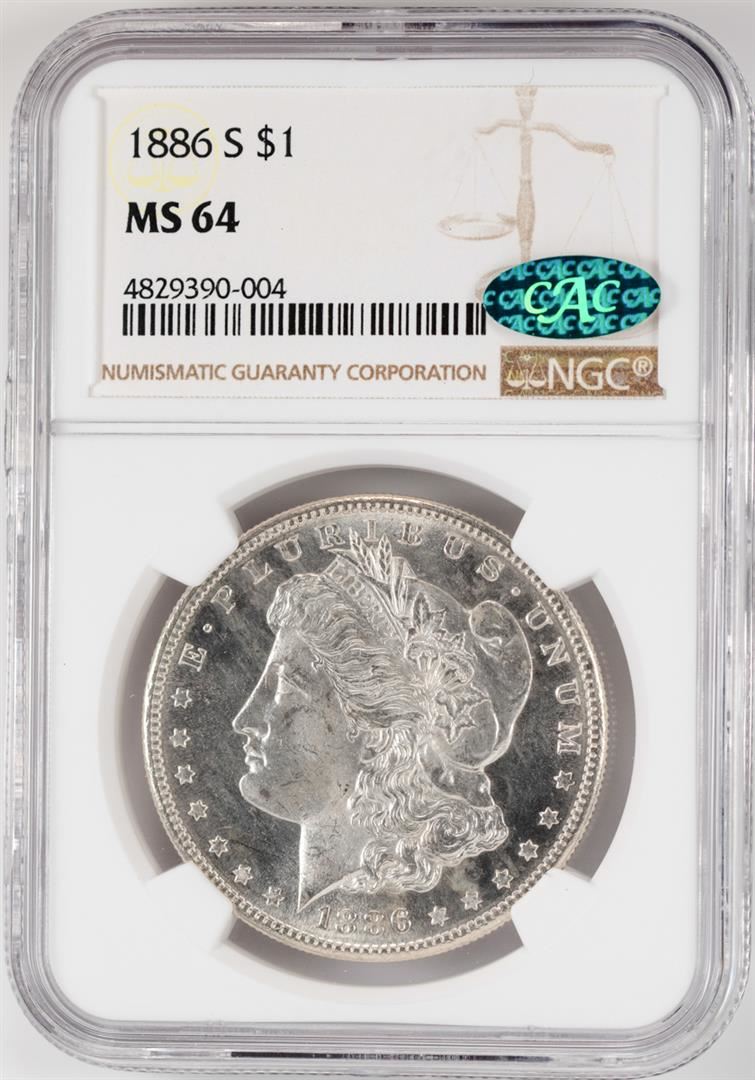 One 1886-S $1 Morgan Silver Dollar Coin NGC MS64 CAC. NGC Certified.