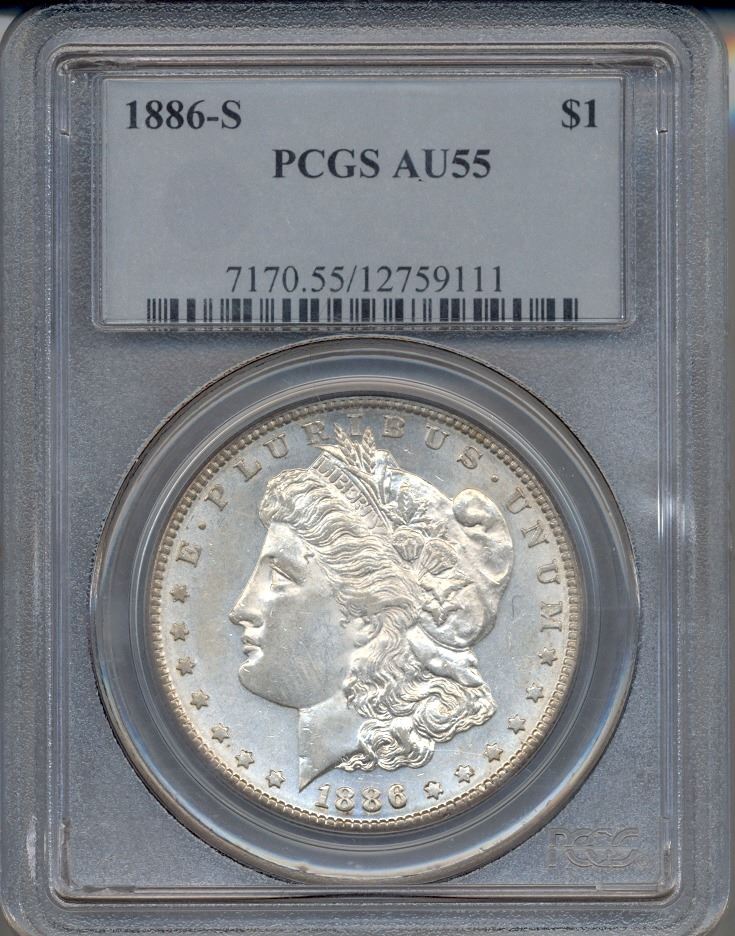 One 1886-S $1 Morgan Silver Dollar Coin PCGS AU55.