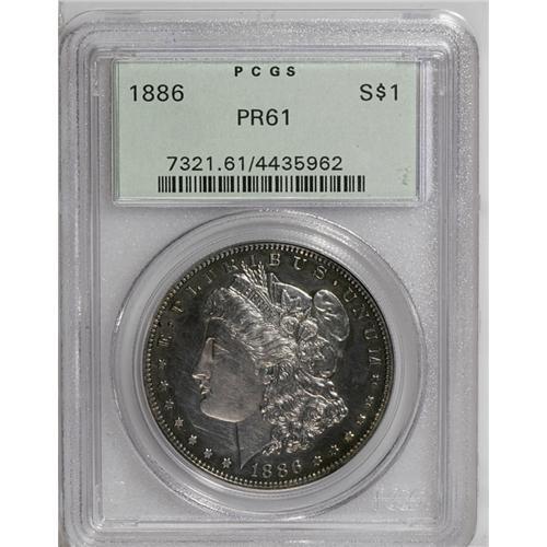 <B>1886<img border='0' src='http://www.heritagecoins.com/images/star.gif' width=10 height=10>$1> PR61 PCGS.</B></I> Though toning has dimmed the mirrors somewhat, the periphery is as reflective as ever. Shades of blue, red, and gold appear in measure on a gunmetal backdrop. Hairlines appear in the fields and a contact mark is noted on Liberty's neck.