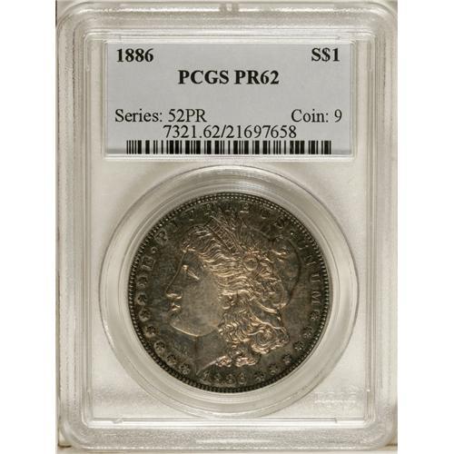 <B>1886 S$1 PR62 PCGS.</B></I> Concentric rings of blue-green and lavender, along with sunset-orange, grace this lovely, though lightly hairlined proof. The number of specimens coined for this year is an apropos 886.<BR><BR><b>Shipping:</b> Coin/Currency (<a target="_blank" href="http://www.heritageauctions.com/common/shipping.php">view shipping information</a>)