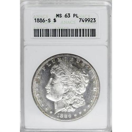 <B>1886-S $1 MS63 Prooflike ANACS.</B></I> NGC Census: (97/93). PCGS Population (89/82). Numismedia Wsl. Price for NGC/PCGS coin in MS63: $392. (#7171)<BR><BR><B>Coin Engraver:</B> George T. Morgan<BR><BR><b>Shipping:</b> Coins & Currency (<a target="_blank" href="http://www.heritageauctions.com/common/shipping.php">view shipping information</a>)