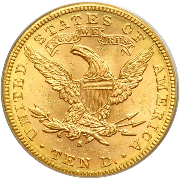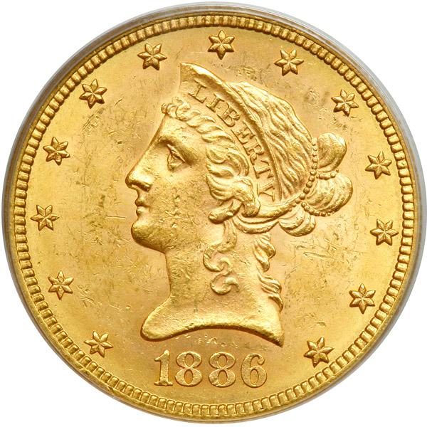 1886-S $10 Liberty. PCGS graded MS-62+. Well struck and delicately toned. A frosty example (PCGS # 8709) .