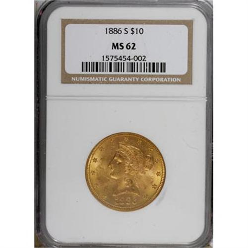 <B>1886-S $10 MS62 NGC.</B></I> NGC Census: (793/181). PCGS Population (577/190). Mintage: 826,000. Numismedia Wsl. Price for NGC/PCGS coin in MS62: $440. (#8709)<BR><BR><B>Coin Engraver:</B> Christian Gobrecht<BR><BR><b>Shipping:</b> Coins & Currency (<a target="_blank" href="http://www.heritageauctions.com/common/shipping.php">view shipping information</a>\)