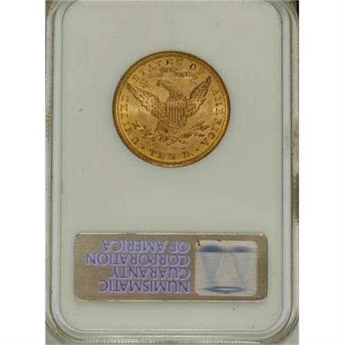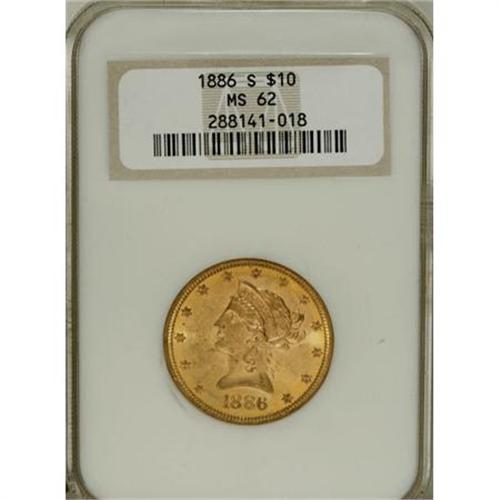 <B>1886-S $10 MS62 NGC.</B></I> NGC Census: (835/189). PCGS Population (588/224). Mintage: 826,000. Numismedia Wsl. Price for NGC/PCGS coin in MS62: $510. (#8709)<BR><BR><B>Coin Engraver:</B> Christian Gobrecht<BR><BR><b>Shipping:</b> Coins & Currency (<a target="_blank" href="http://www.heritageauctions.com/common/shipping.php">view shipping information</a>)
