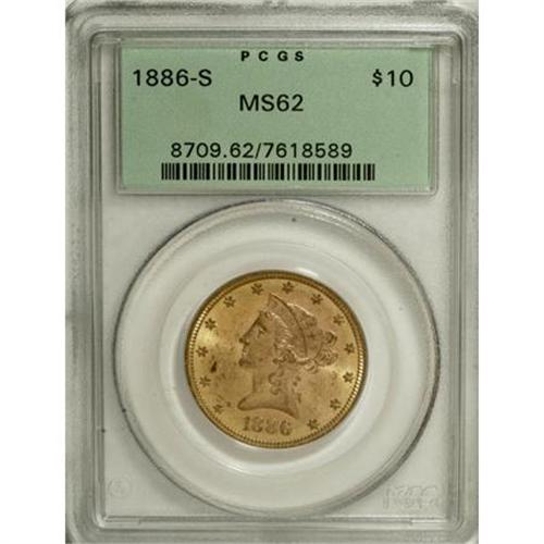 <B>1886-S $10 MS62 PCGS.</B></I> PCGS Population (577/190). NGC Census: (794/181). Mintage: 826,000. Numismedia Wsl. Price for NGC/PCGS coin in MS62: $440. (#8709)<BR><BR><b>Shipping:</b> Coins & Currency (<a target="_blank" href="http://www.heritageauctions.com/common/shipping.php">view shipping information</a>)