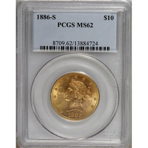 <B>1886-S $10 MS62 PCGS.</B></I> PCGS Population (577/190). NGC Census: (793/181). Mintage: 826,000. Numismedia Wsl. Price for NGC/PCGS coin in MS62: $440. (#8709)<BR><BR><B>Coin Engraver:</B> Christian Gobrecht<BR><BR><b>Shipping:</b> Coins & Currency (<a target="_blank" href="http://www.heritageauctions.com/common/shipping.php">view shipping information</a>\)
