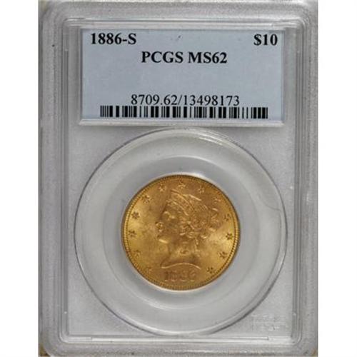 <B>1886-S $10 MS62 PCGS.</B></I> PCGS Population (563/206). NGC Census: (808/185). Mintage: 826,000. Numismedia Wsl. Price for NGC/PCGS coin in MS62: $440. (#8709)<BR><BR><B>Coin Engraver:</B> Christian Gobrecht<BR><BR><b>Shipping:</b> Coins & Currency (<a target="_blank" href="http://www.heritageauctions.com/common/shipping.php">view shipping information</a>)
