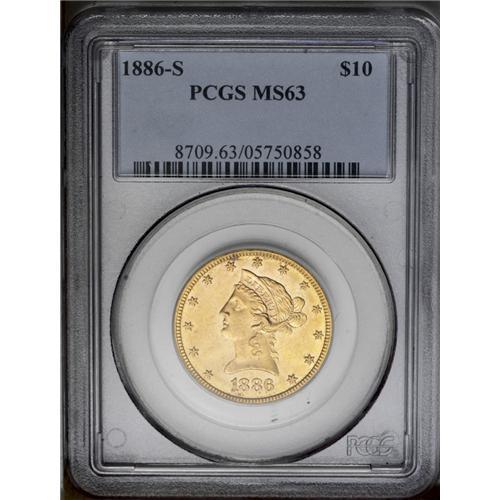 <B>1886-S<$10> MS63 PCGS.</B></I> A fully lustrous and well struck apricot-gold piece that approaches a higher grade, but has a thin vertical mark beneath the left (facing) wing. The 1 in the date is lightly repunched north.