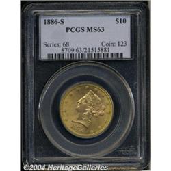 <B>1886-S<$10> MS63 PCGS.</B></I> Well struck, with lustrous apricot-gold patination. Several small, evenly distributed ticks limit the grade. <BR><BR><B>Important notice:</B> Heritage usually auctions material at the rate of 200-250 lots per hour. On some occasions eBay Live bid software or the Internet may not be able to keep up with the pace of the auction. We recommend placing a realistic absentee bid now as insurance to avoid disappointment. Occasionally the auctioneer may eliminate or reject an eBay Live bid, and the auctioneer may also reopen a lot after the close of the eBay live bidding (usually because we missed an audience bid), and may reject your bid even if it shows you as the winning bidder. By bidding via eBay Live, you agree that Heritage may award the lot to another bidder at its sole discretion under the circumstances described above or any other reasonable circumstances. Since eBay bids are not shown to us until we open the lot on the floor, we treat those bids just like floor bids. In most cases the floor responds before the eBay bid is presented to us, due to Internet lag time, so for consistency we have made it a policy that floor bids are always considered first over tie eBay live bids. Also please note that all Heritage lots purchased through eBay Live carry a 20% Buyer's Premium. Please make sure you read the Terms and Conditions before you bid. </span></font></tr></table></td></tr></table>