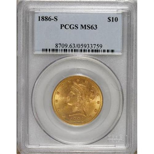 <B>1886-S $10 MS63 PCGS.</B></I> A satiny and attractive Liberty ten that boasts a sharp strike with fewer marks than is usual for the MS63 grade. The 1886-S is plentiful in abraded Mint State, but lustrous examples with eye appeal are scarce.<BR><BR><b>Shipping:</b> Coins & Currency (<a target="_blank" href="http://www.heritageauctions.com/common/shipping.php">view shipping information</a>)