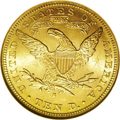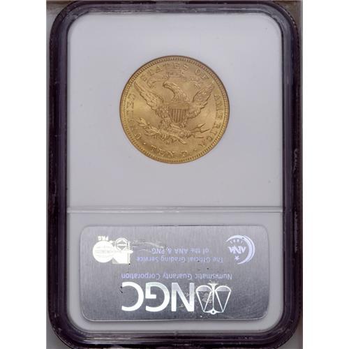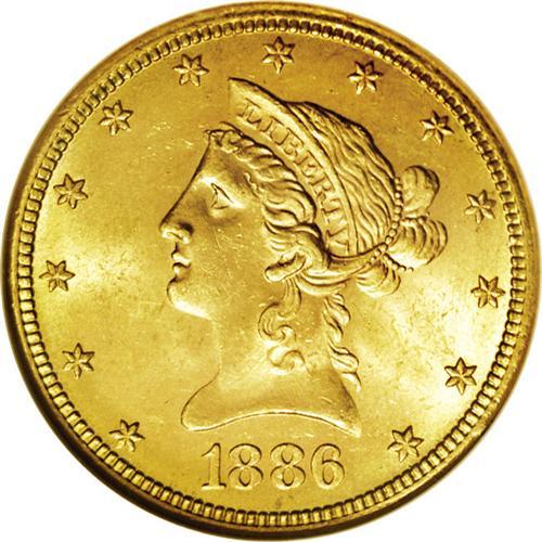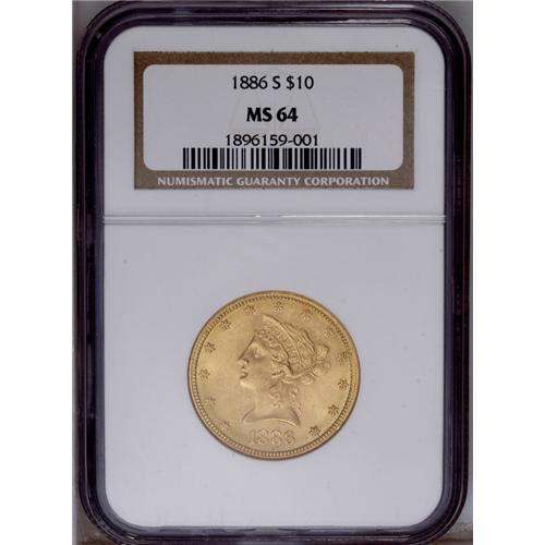 <B>1886-S $10 MS64 NGC.</B></I> A lustrous and boldly impressed Liberty ten with a clean reverse and only moderate obverse grazes. The San Francisco Mint produced a sizeable majority of the half eagles, eagles, and double eagles struck between 1885 and 1889. However, the 1886-S becomes a significant condition rarity as a near-Gem. NGC and PCGS combined have certified 15 pieces at the MS64 level with none finer.